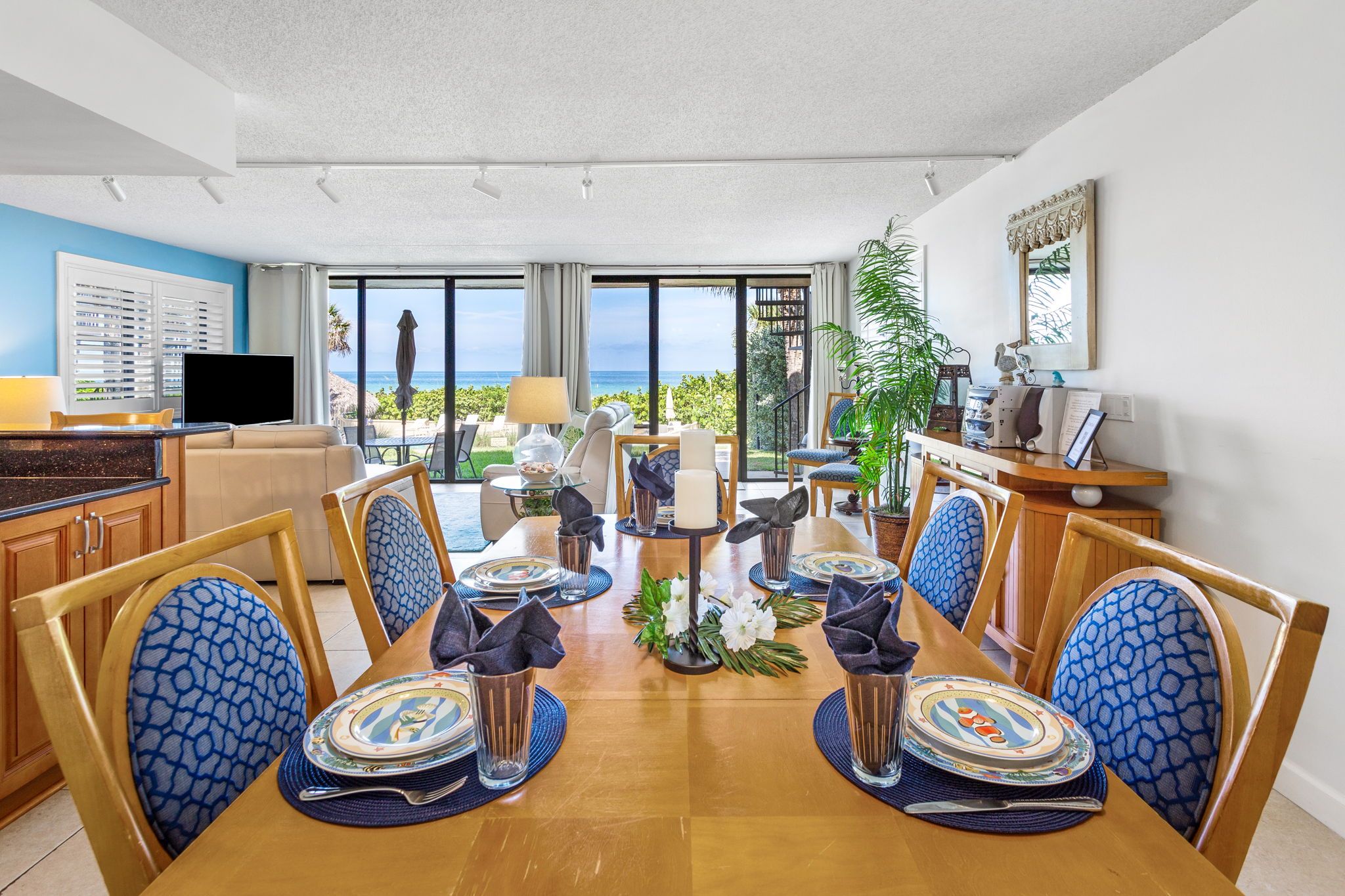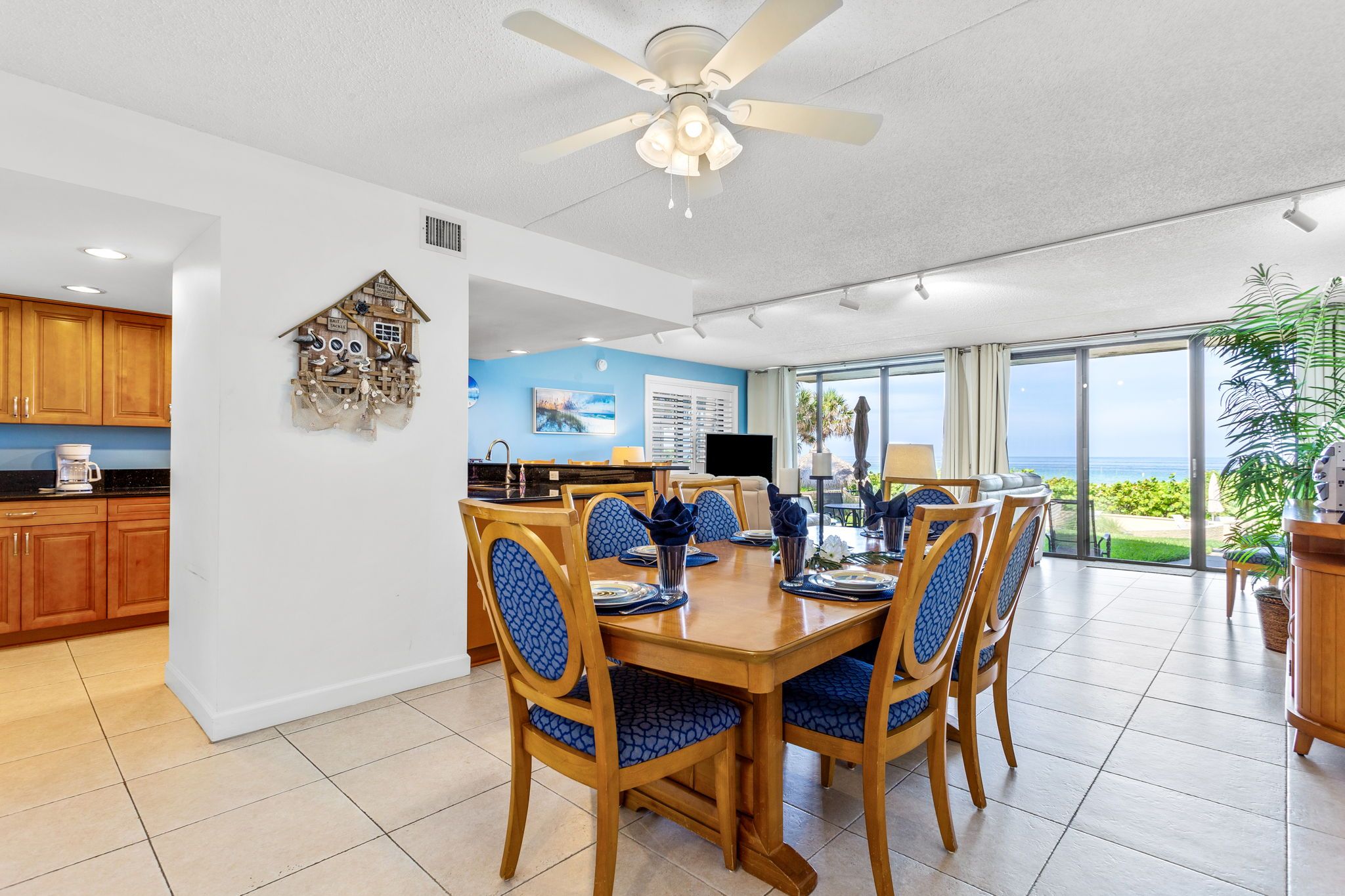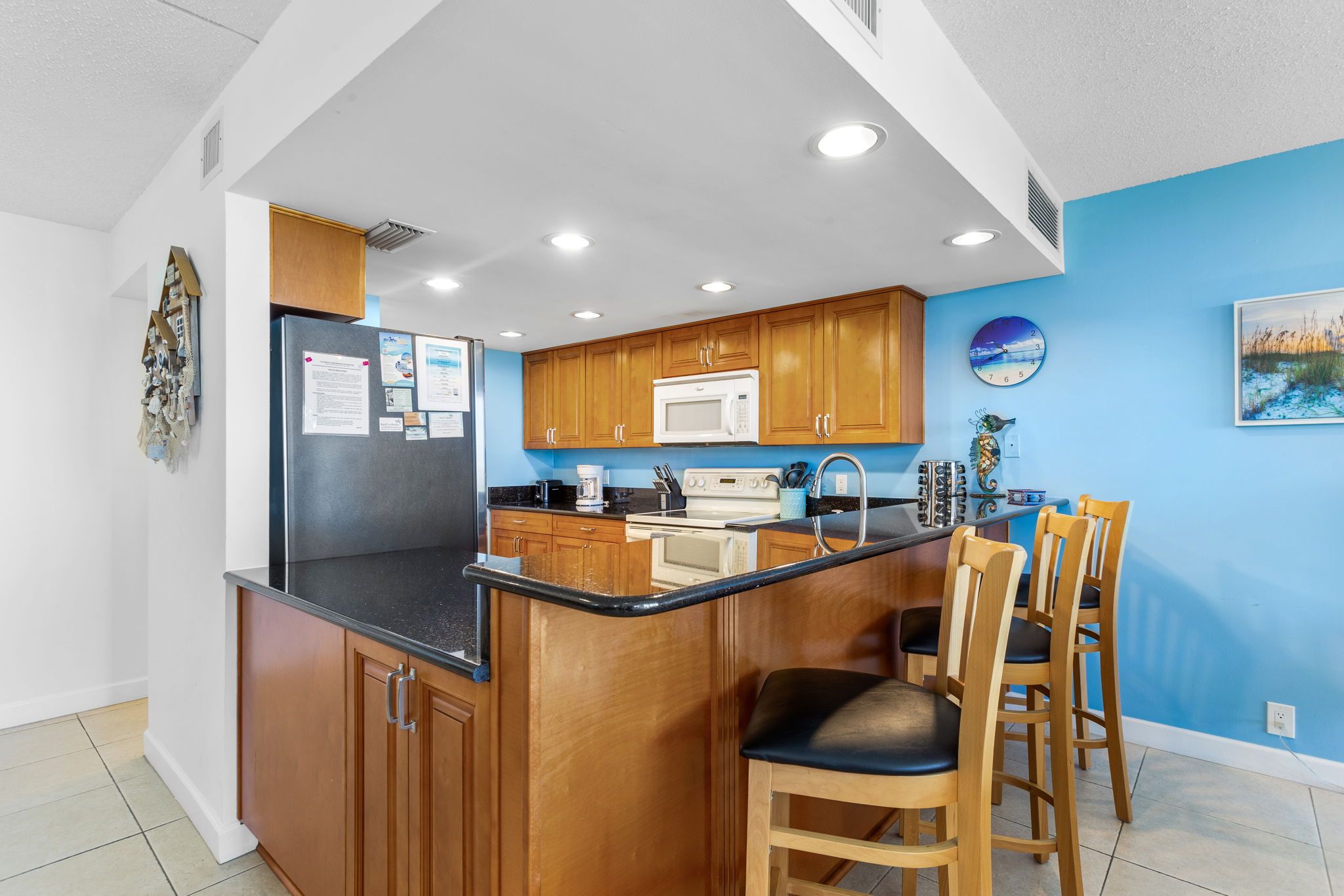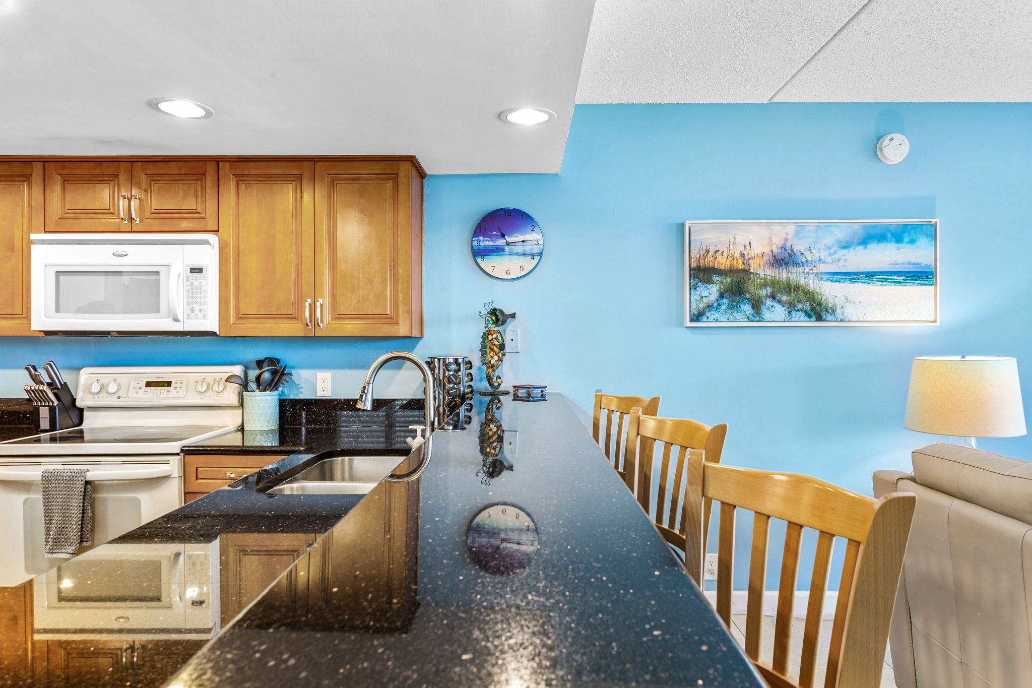 The dining area comfortably accommodates 6 guests. We have a fully equipped kitchen with granite countertops and everything you would need for your family breakfast or dinner. All while taking in the beautiful views and scenery of the Gulf of Mexico.