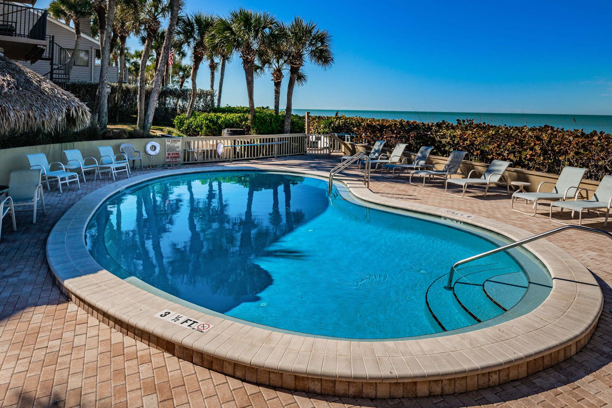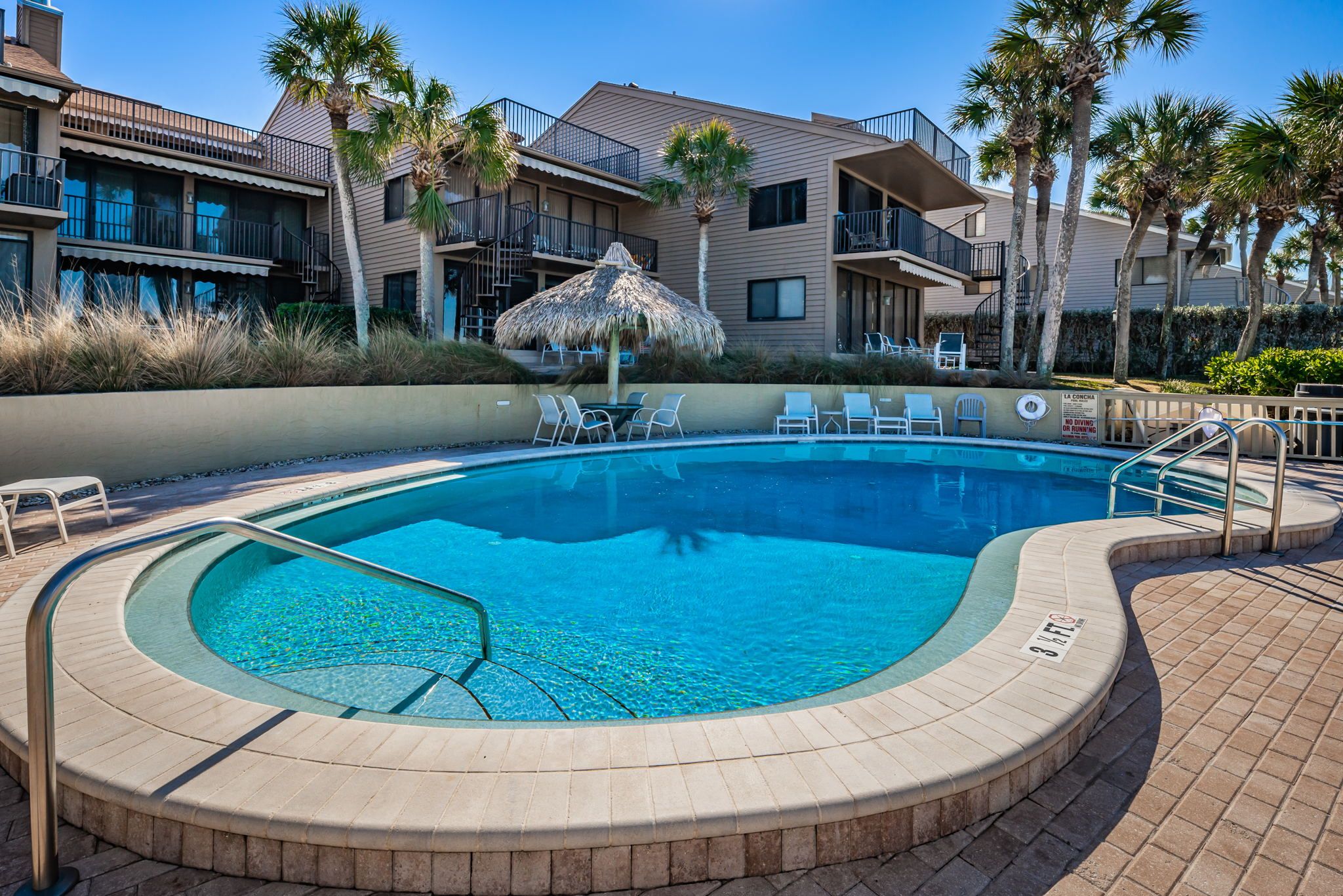 Right on the water-just steps out the door! Everything was very clean and in great shape. Great night’s sleep on the king sized bed in master bedroom. Plenty of great kitchen supplies and very well furnished condo. Usually pool is heated very nicely; unfortunately this year a part was needed for the heater and was on back-order so pool was a bit chilly. Already booked for next year as this is a great location!