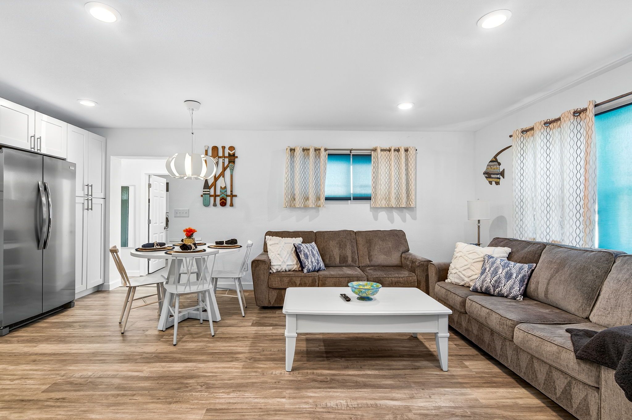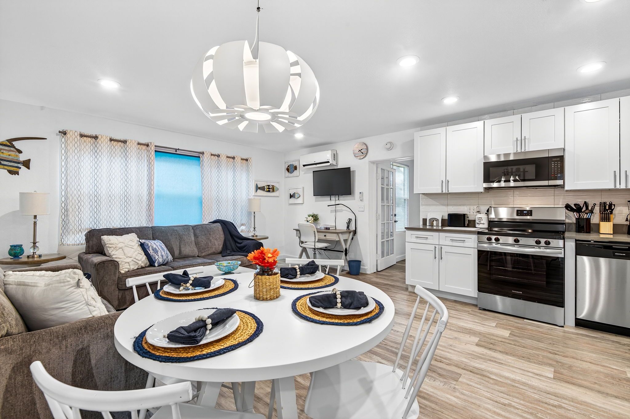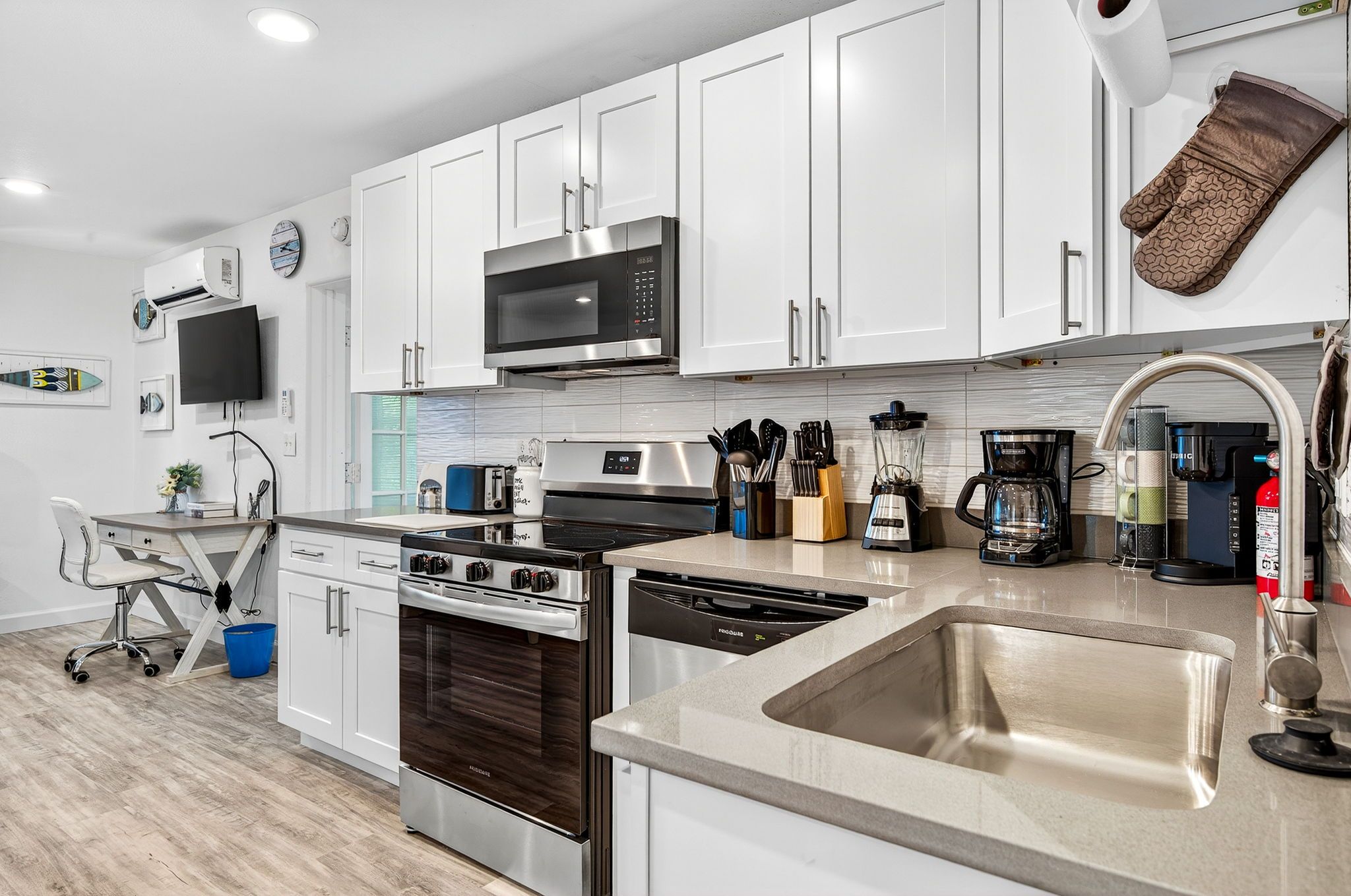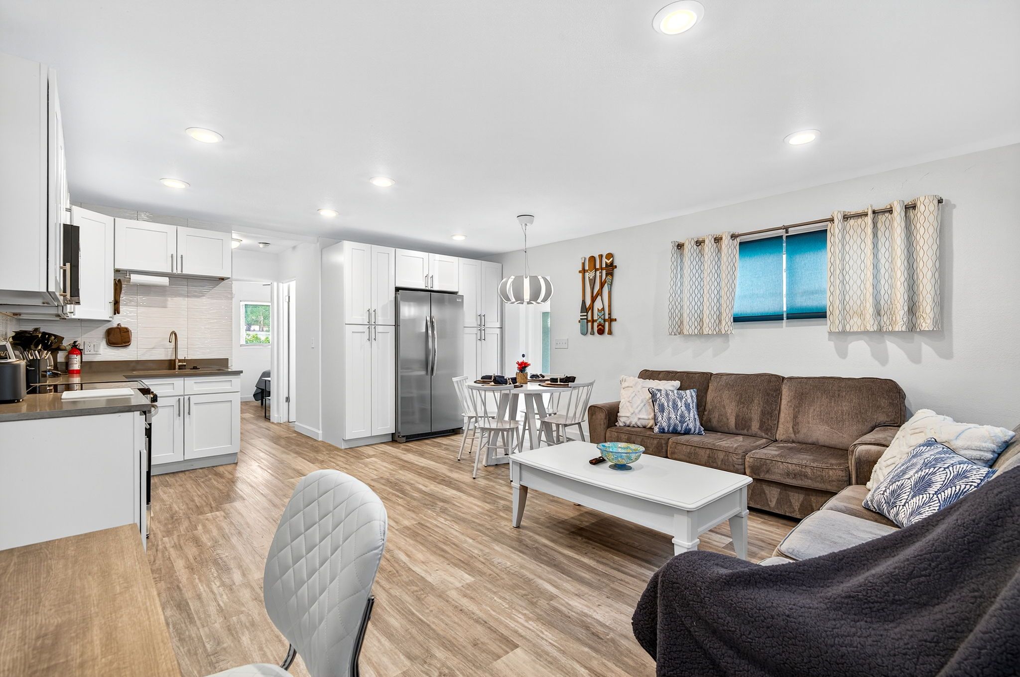 The living, dining, and kitchen areas flow seamlessly together, creating a bright and inviting space for everyone to gather. The kitchen features beautiful quartz countertops, stainless steel appliances, and brand-new cabinetry, providing both style and functionality for your stay.