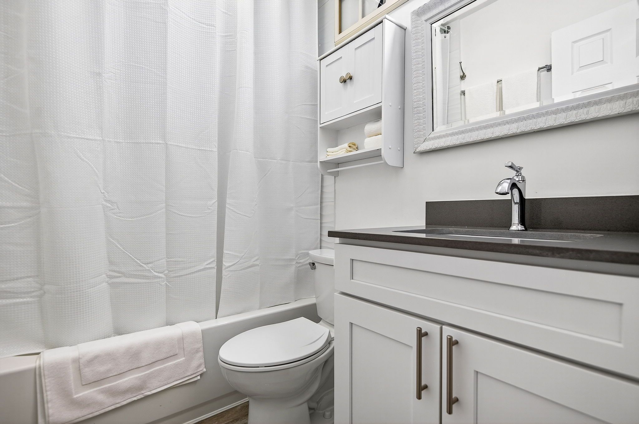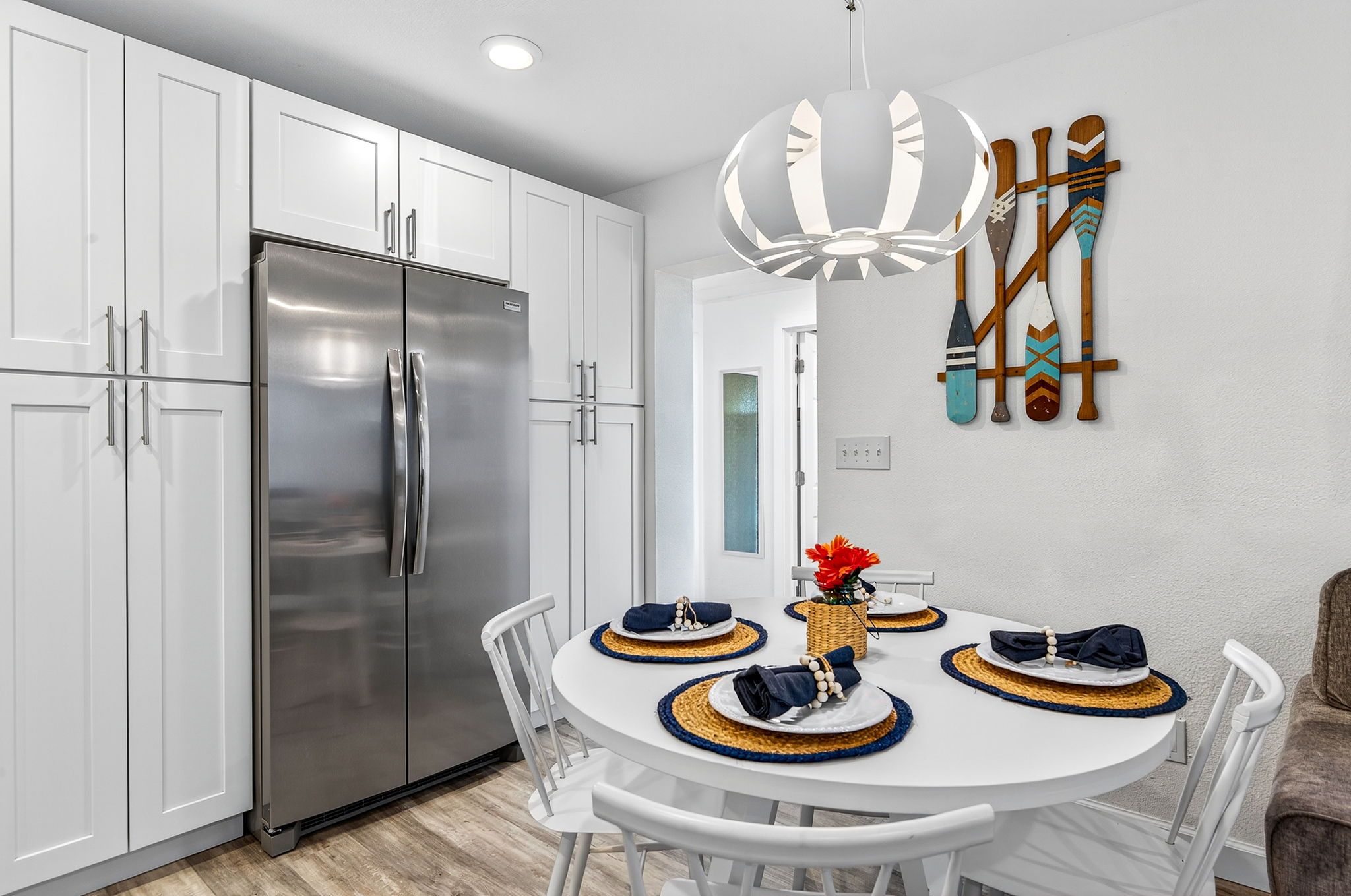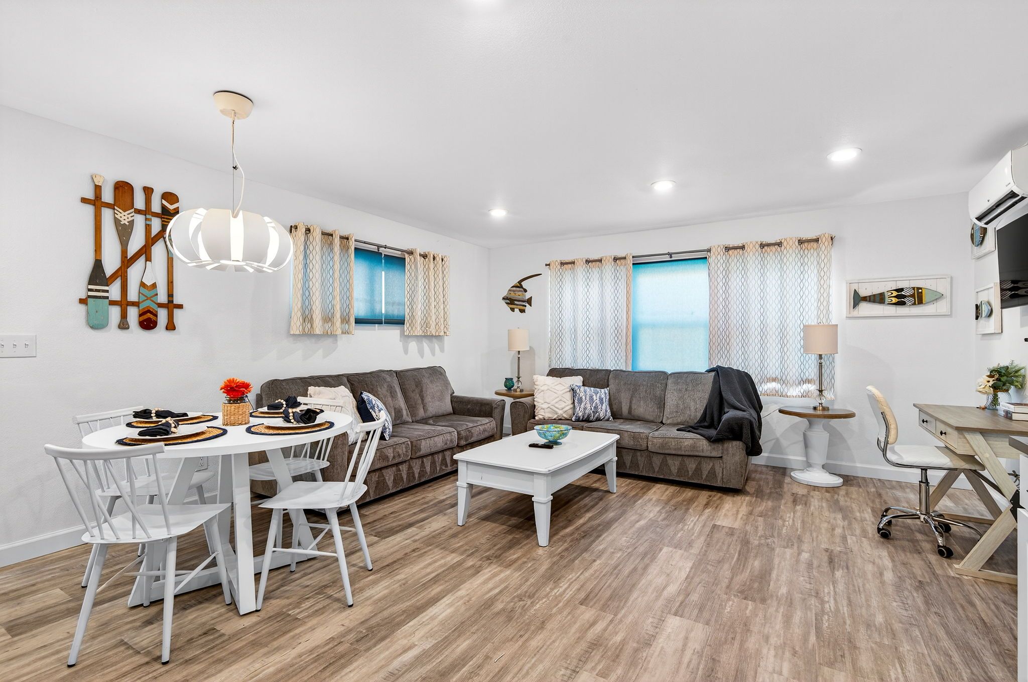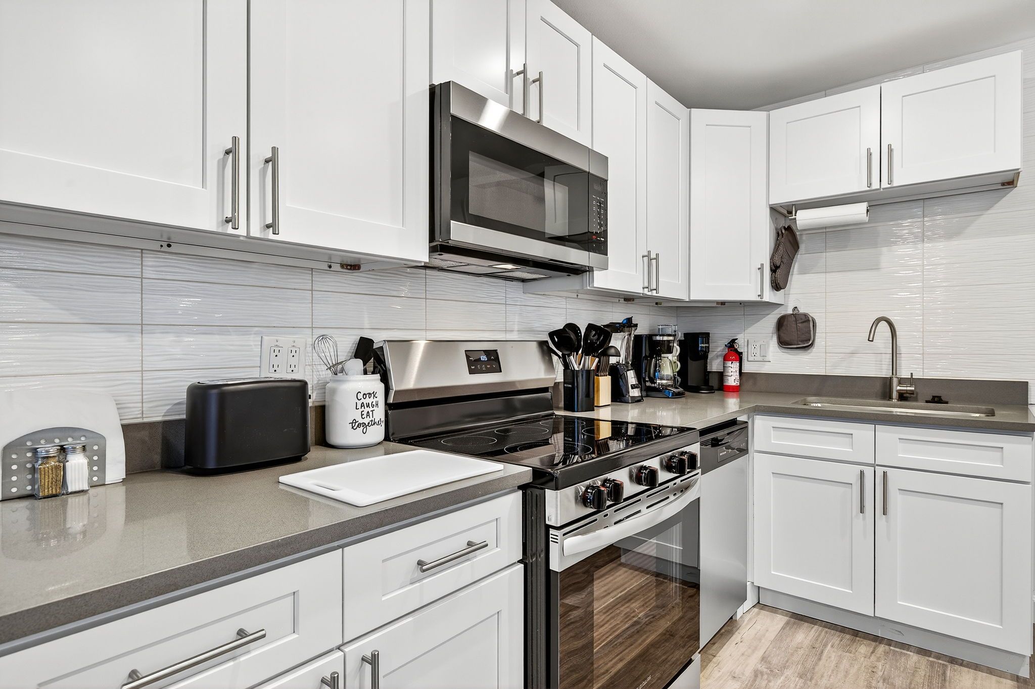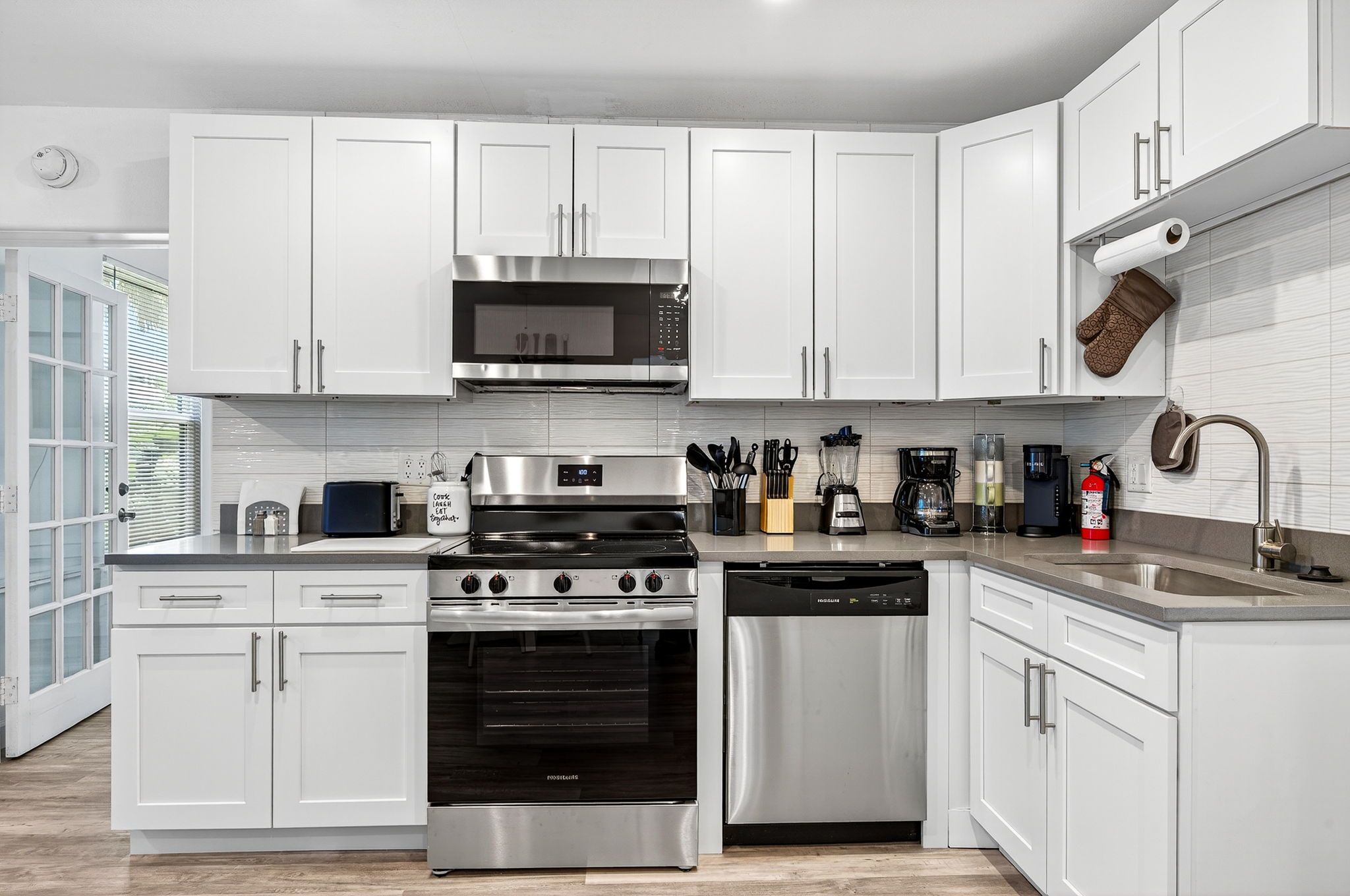 The living, dining, and kitchen areas flow seamlessly together, creating a bright and inviting space for everyone to gather. The kitchen features beautiful quartz countertops, stainless steel appliances, and brand-new cabinetry, providing both style and functionality for your stay.